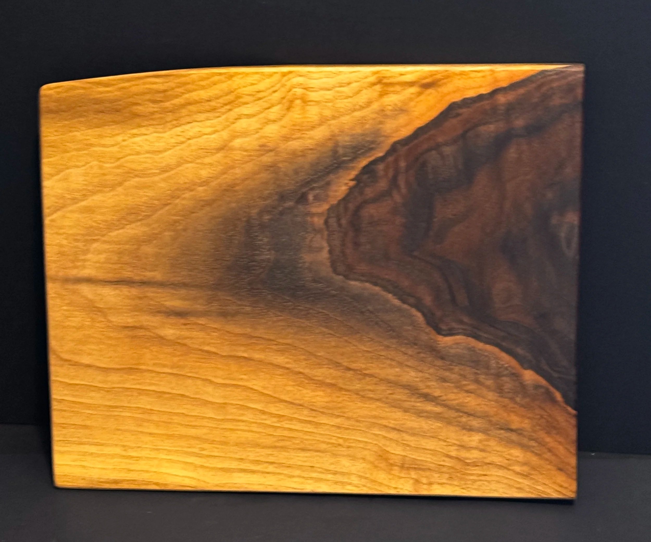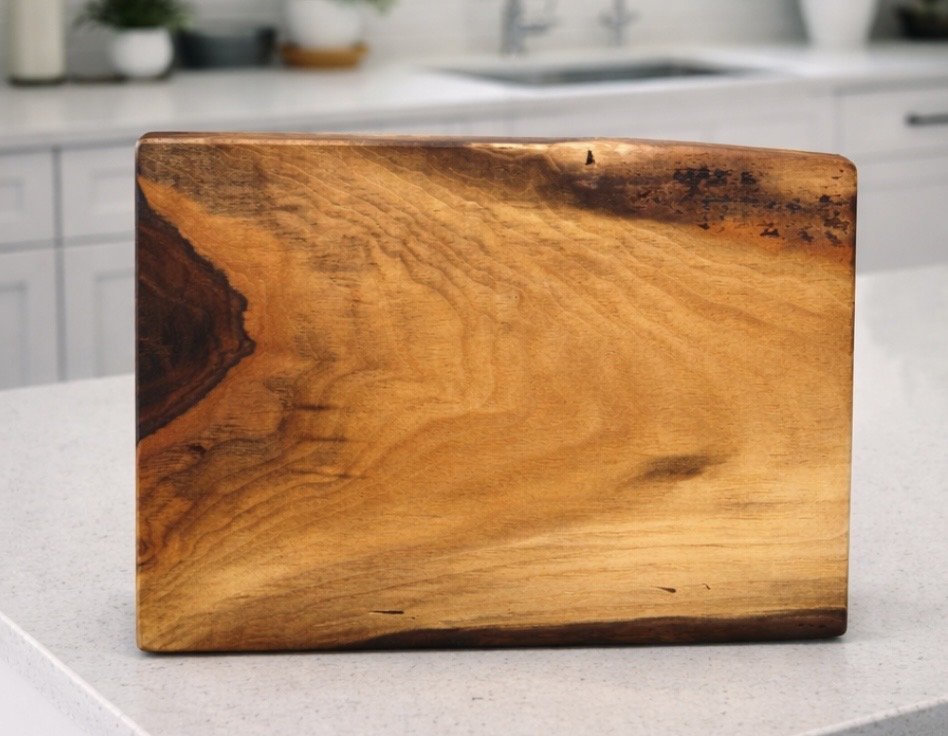 Walnut cutting board with rich, warm grain lines in unique patterns.