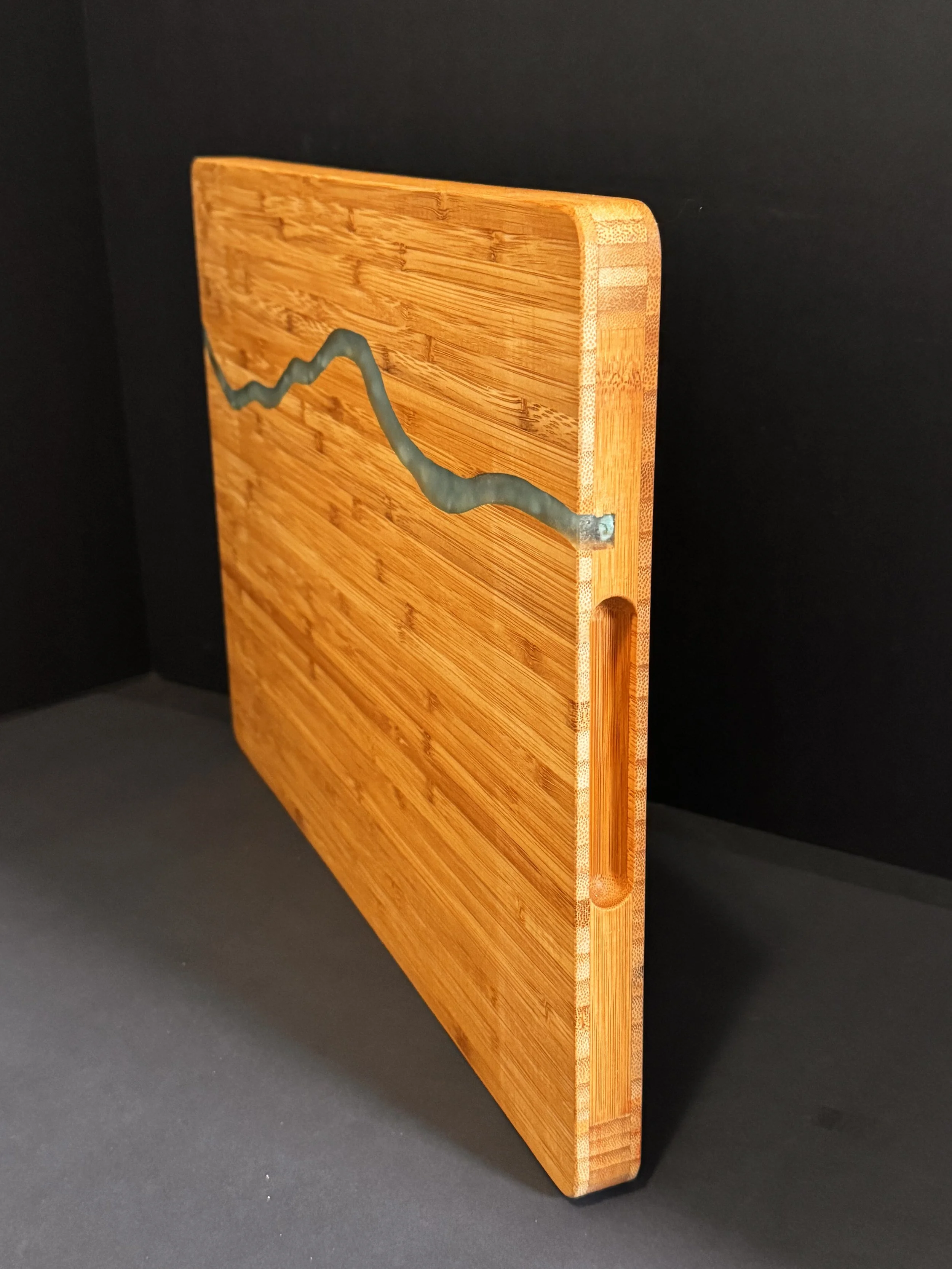 Bamboo Turquoise River Board with inlay of turquoise gems embedded in food safe epoxy. This gorgeous board features a juice groove on the flip side, as well as handle channels on the sides.